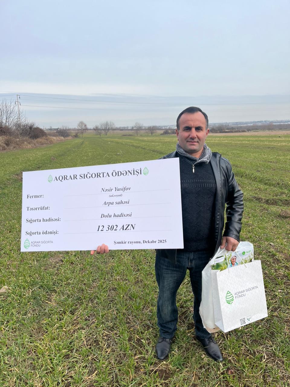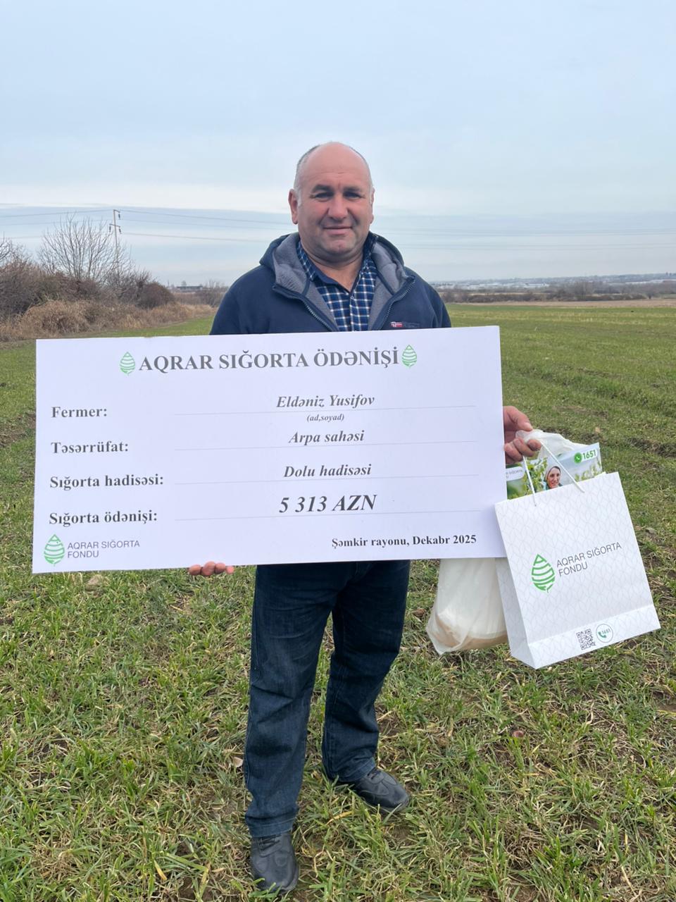 Həmin kənddən olan digər fermer Eldəniz Yusifov isə 2025-ci ildə 10,6 hektar arpa sahəsini sığortalayıb və bunun üçün 364 manat sığorta haqqı ödəyib. May ayında baş verən dolu hadisəsi onun da əkin sahəsinə zərər vurub və aparılmış zərər qiymətləndirməsi nəticəsində fermerə 5 313 manat məbləğində sığorta ödənişi edilib.
