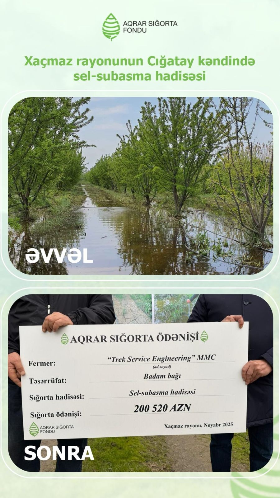 Xaçmaz rayonunun Cığatay kəndində yerləşən “Trek Service Engineering” MMC-yə məxsus badam bağında sel-subasma nəticəsində yaranmış zərərə görə 200 520 manat məbləğində sığorta ödənişi edilib.