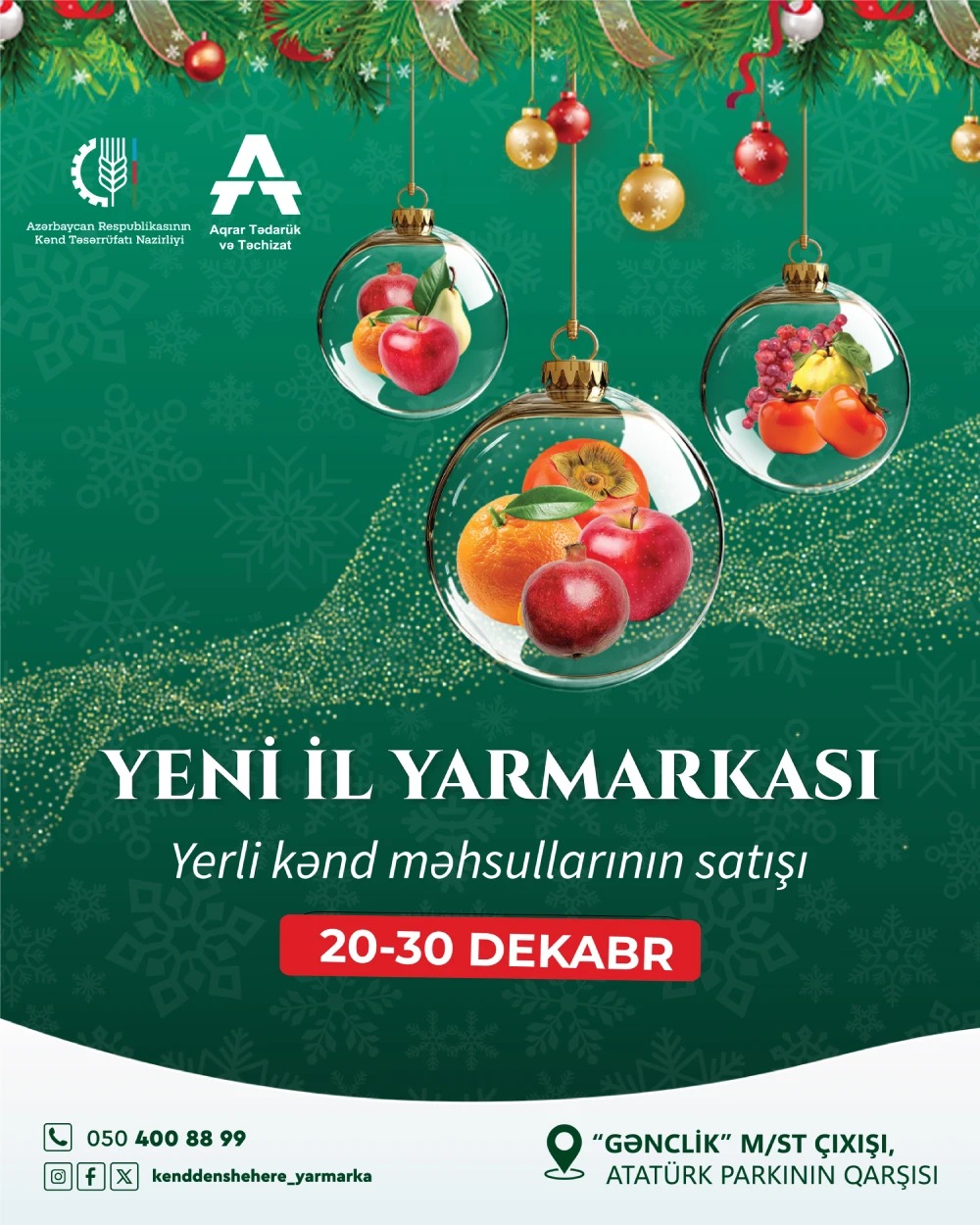 Sabahdan etibarən Kənd Təsərrüfatı Nazirliyinin tabeliyində “Aqrar Tədarük və Təchizat” ASC-nin təşkilatçılığı ilə sayca 8-ci “Kənddən Şəhərə” Yeni il yarmarkası fəaliyyətə başlayır.