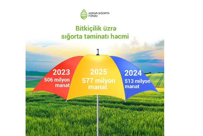 Əkin sahələrinin sığortalanmasından 13 milyon manat aqrar sığorta haqqı toplanılıb. Bunun müqabilində sığorta müqavilələri üzrə əkin sahələrinə 577 milyon manat sığorta təminatı verilib. Əkin sahələrinə verilən sığorta təminatının məbləği 2024-cü illə müqayisədə 64 milyon manat, 2023-cü illə müqayisədə isə 71 milyon manat artıb.
