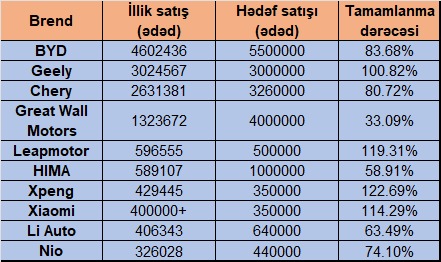 Aşağıdakı cədvəldə 2025-ci il ərzində Çin avtomobil istehsalçılarının illik satış sayı, hədəfləri və qarşıya qoyulan hədəflərin tamamlanma faizləri göstərilib: