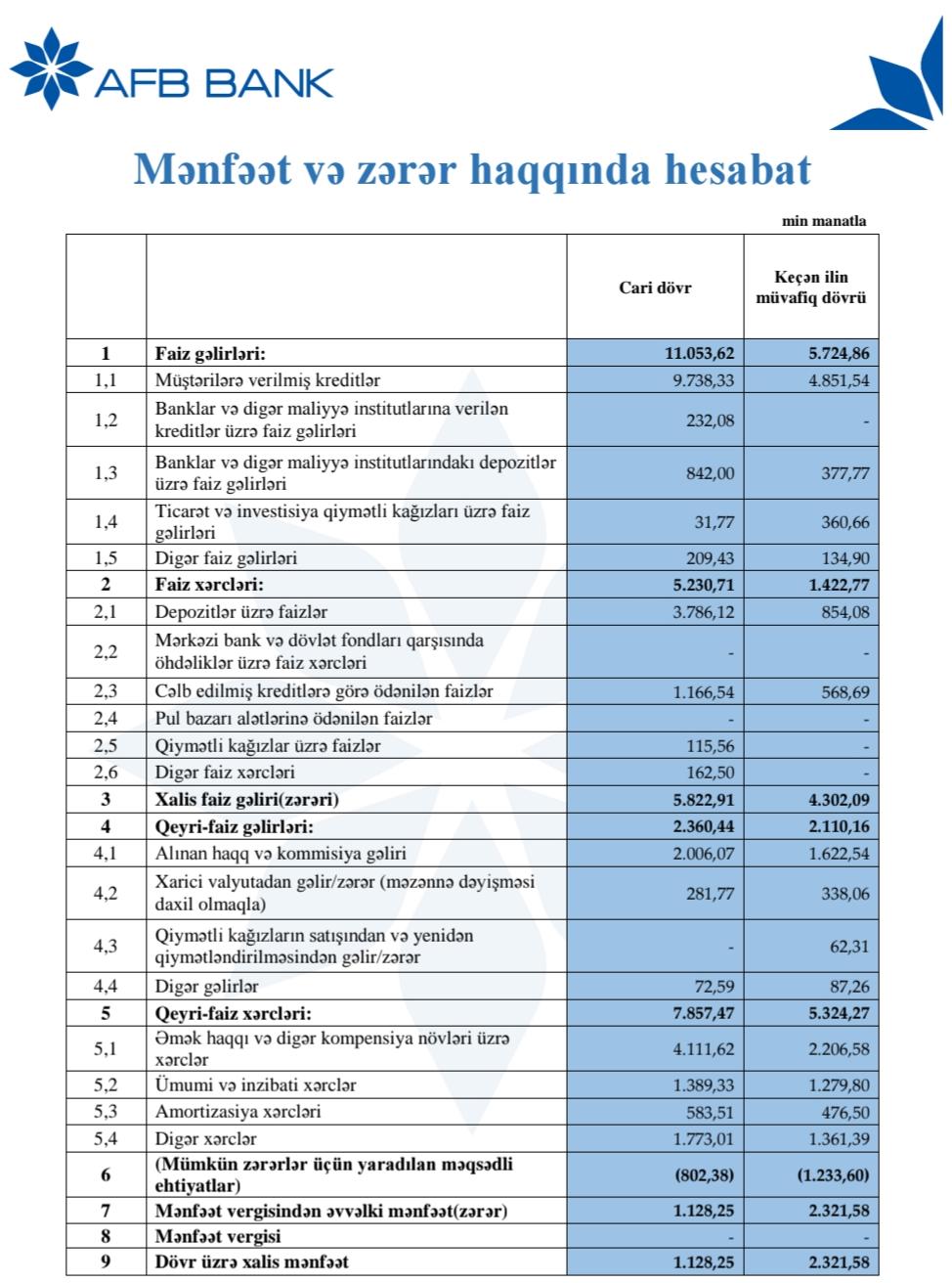 “AFB Bank” ASC cari ilin birinci rübünün sonuna olan maliyyə nəticələrini açıqlayıb.