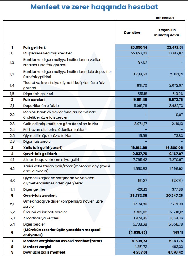 Mənfəətə müsbət təsir edən amil isə bankın mümkün zərərlər üçün yaratdığı məqsədli ehtiyatların geri qaytarılması olub. Əgər əvvəlki il bu ehtiyatlara 148 min manat ayrılmışdısa, cari dövrdə əksinə, həmin ehtiyatlardan 4,5 milyon manatlıq bərpa qeydə alınıb.