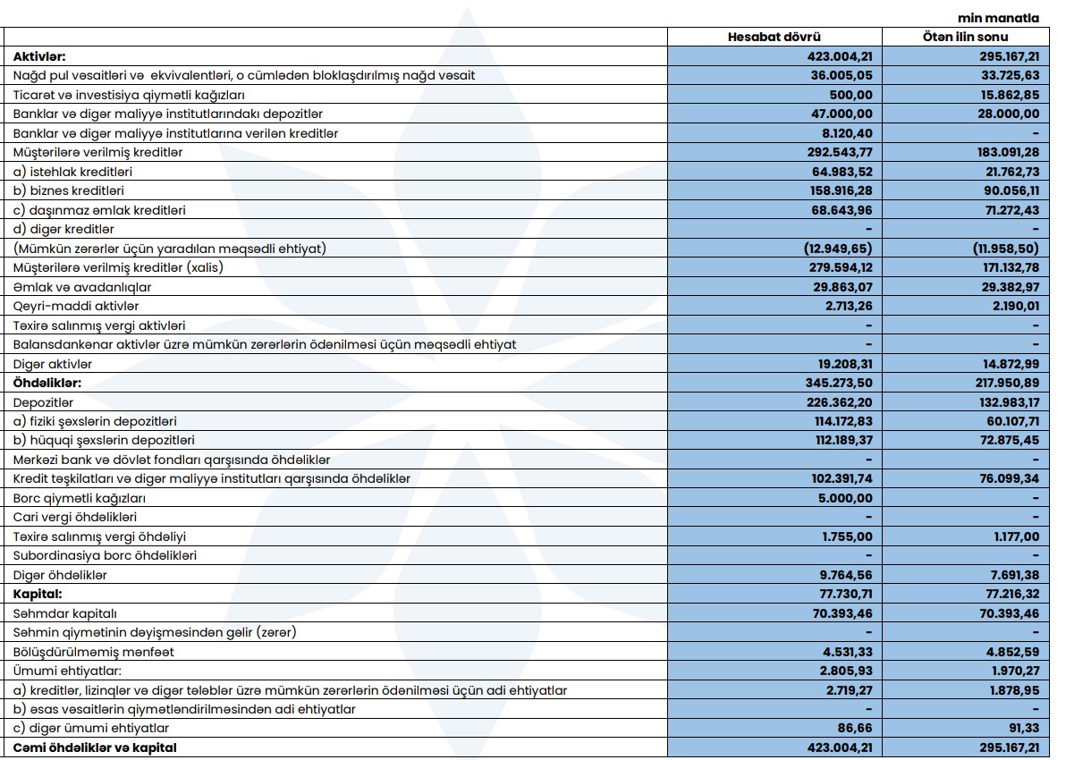 Səhmdar kapitalı isə dəyişməyərək 70,4 milyon manat səviyyəsində qalıb.
