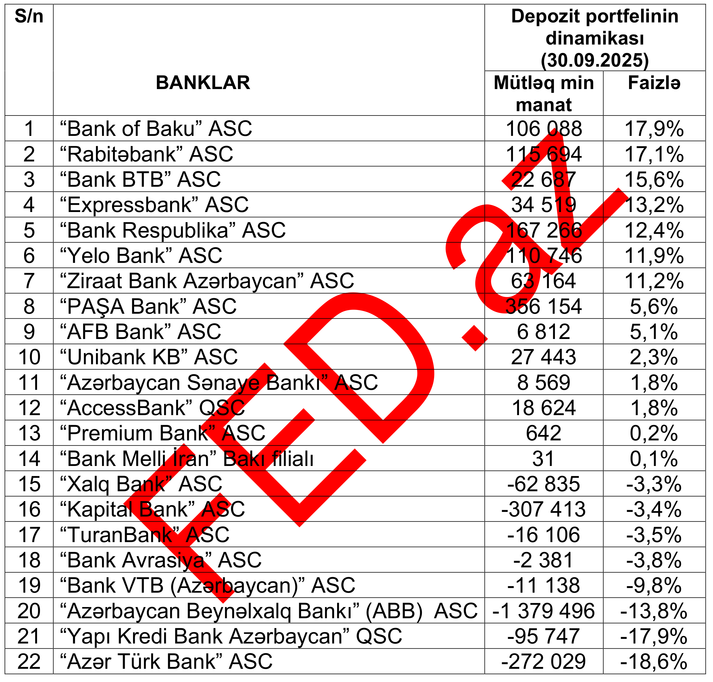 Azərbaycanda depozit portfelinin dinamikası üzrə – BANKLARIN RENKİNQİ (30.09.2025)
