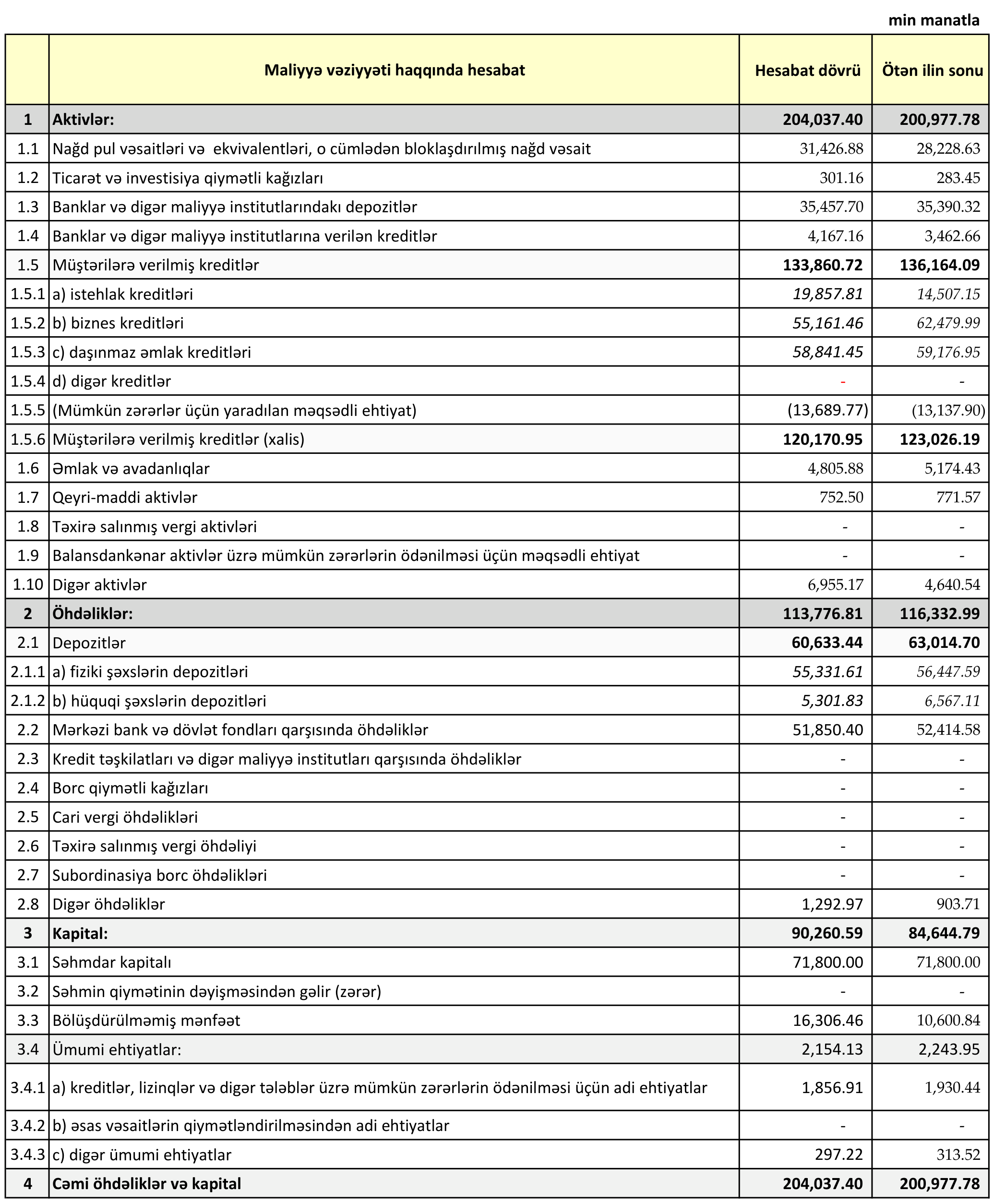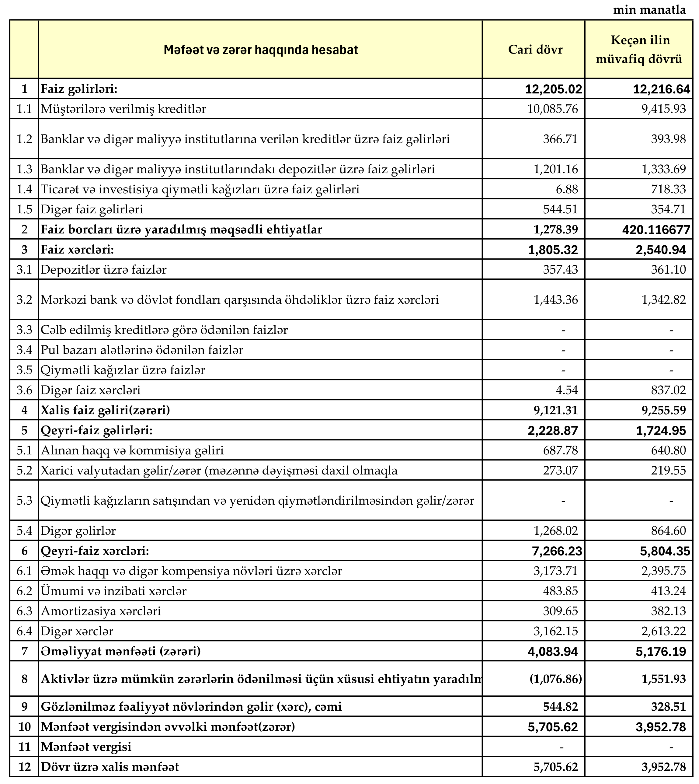 Bundan müştərilərə verilmiş kreditlərdən əldə edilən gəlirlər 10,1 milyon manata bərabər olub ki, bu da illik 670 min manat (7,1%) artım deməkdir.