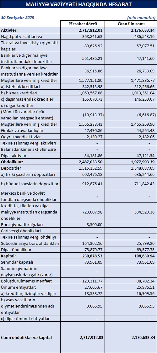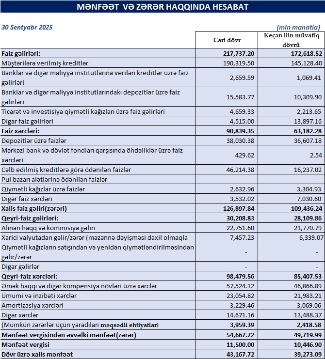 Bank 2025-ci ilin 9 ayını 43,2 milyon manat xalis mənfəətlə başa vurub. Bu, ötən ilin eyni dövrünün nəticəsindən 3,9 milyon manat və ya 9,9% çoxdur.
