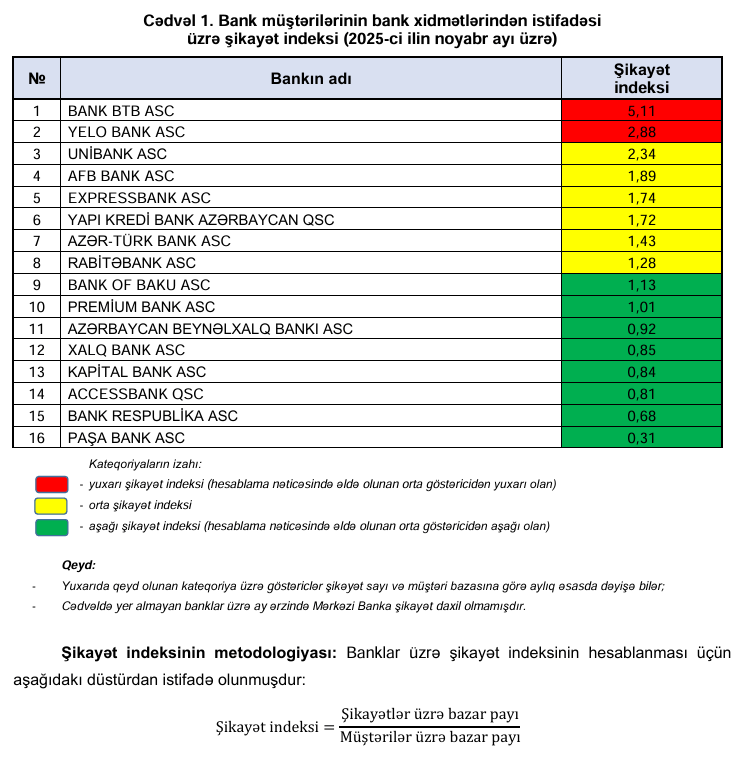 FAzərbaycanda 2025-ci ilin noyabr ayı üzrə bank müştərilərinin bank xidmətlərindən istifadəsi üzrə şikayət indeksi açıqlanıb: