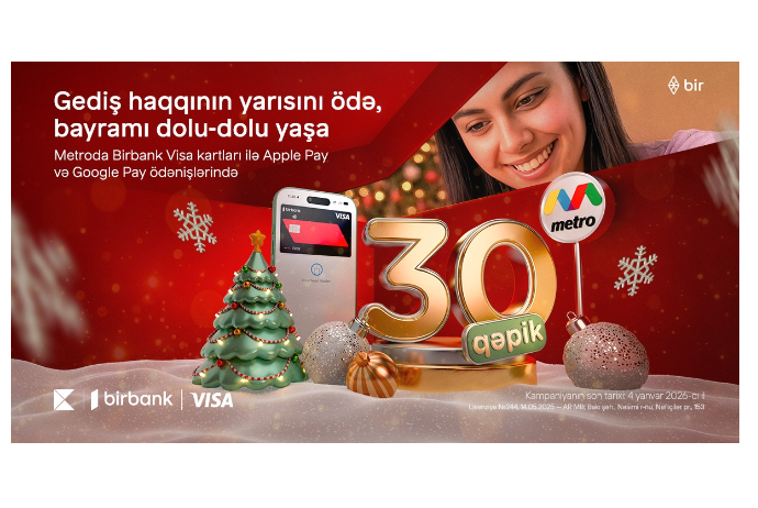 FED.az xəbər verir ki, 16 dekabr 2025-ci il tarixindən 4 yanvar 2026-cı ilədək davam edəcək kampaniya müddətində Birbank Visa kart sahibləri Bakı metrosundan istifadə zamanı gediş haqqının sadəcə yarısını ödəyəcəklər.