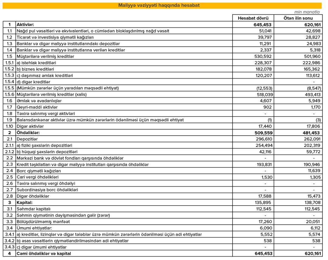 Digər öhdəliklər 17,6 milyon manat, cari vergi öhdəlikləri isə 1,5 milyon manat təşkil edib.