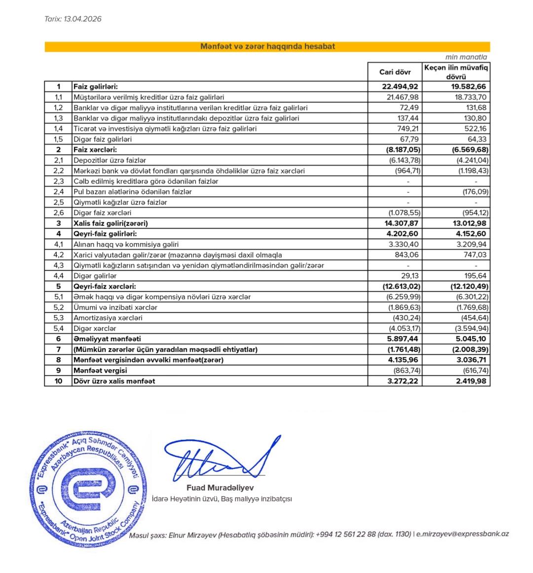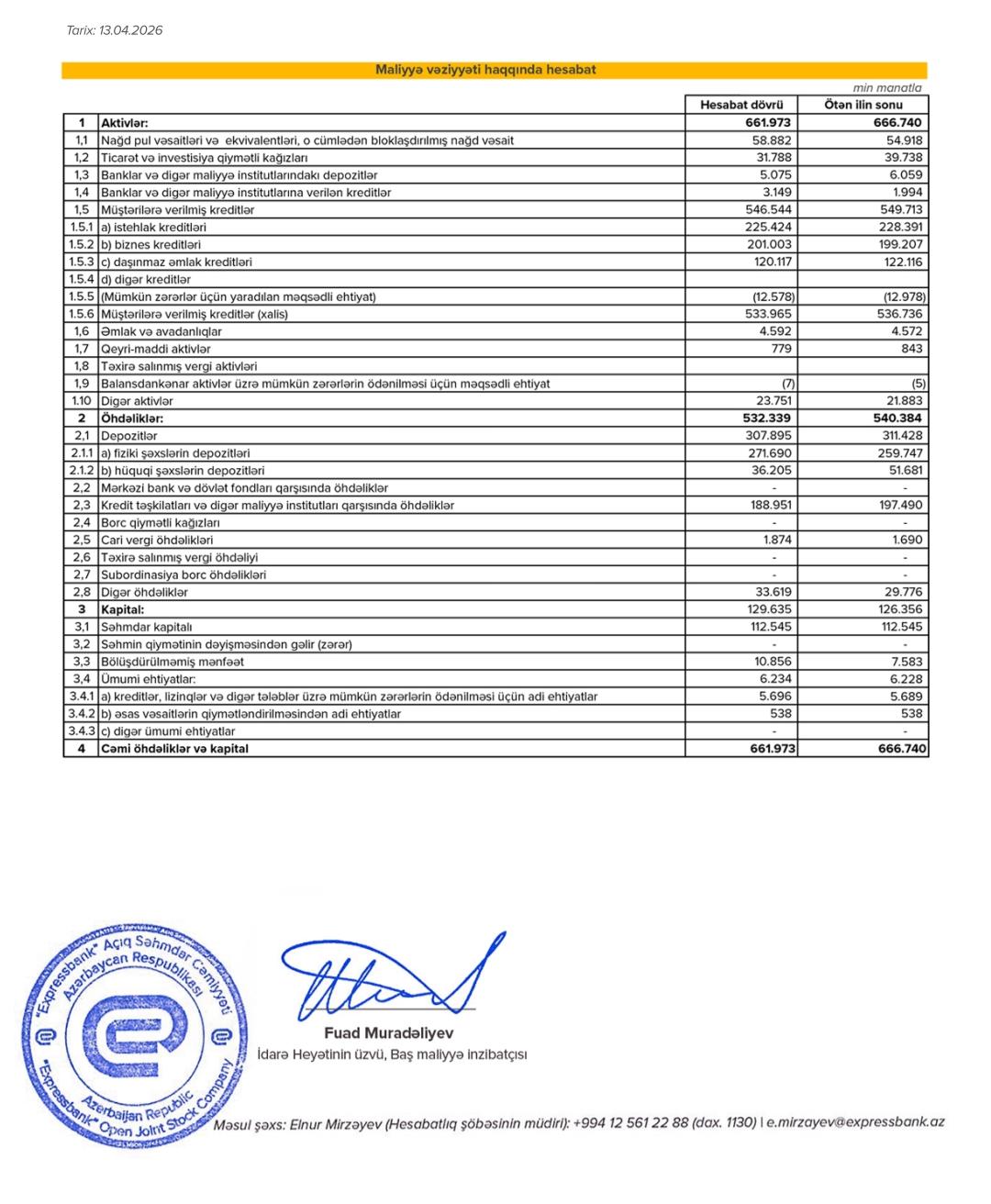 “Expressbank” ASC 2026-cı ilin birinci rübünün sonuna olan maliyyə nəticələrini açıqlayıb.