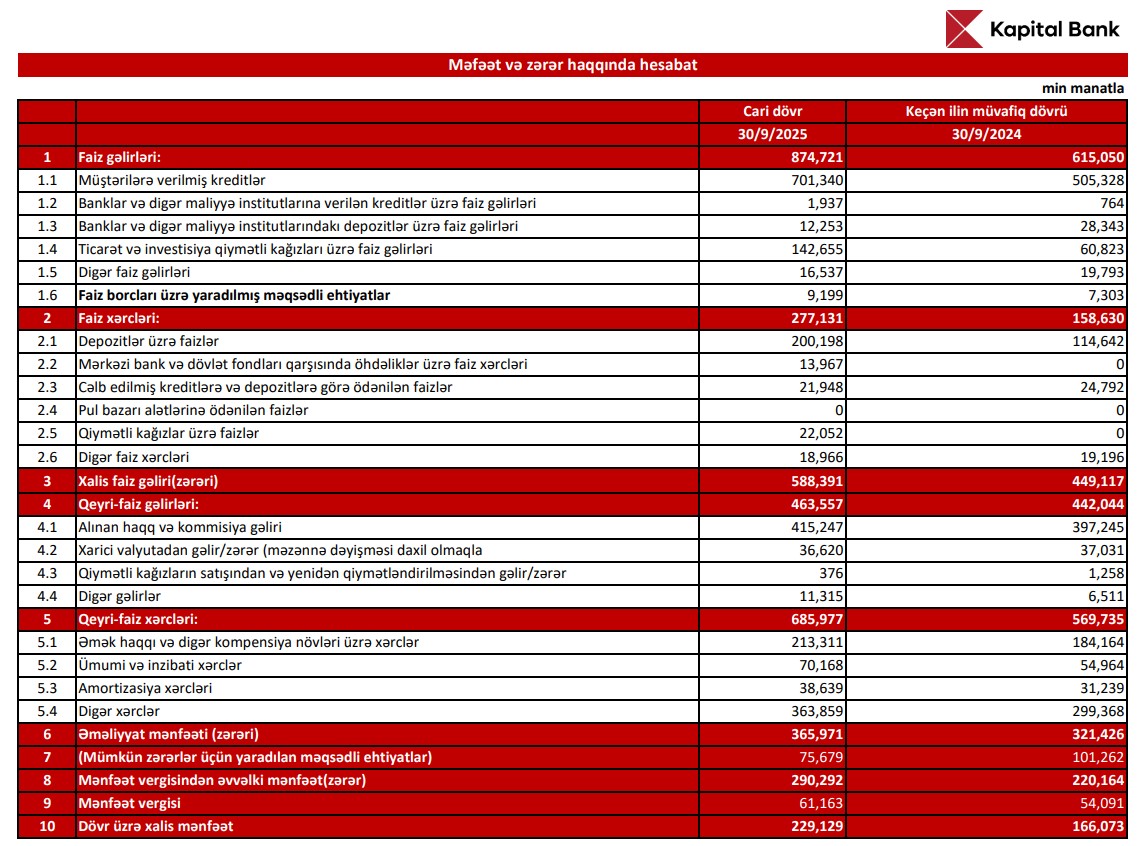 “Kapital Bank” ASC 2025-ci ilin ilk 9 ayının yekunlarına dair maliyyə hesabatını açıqlayıb.