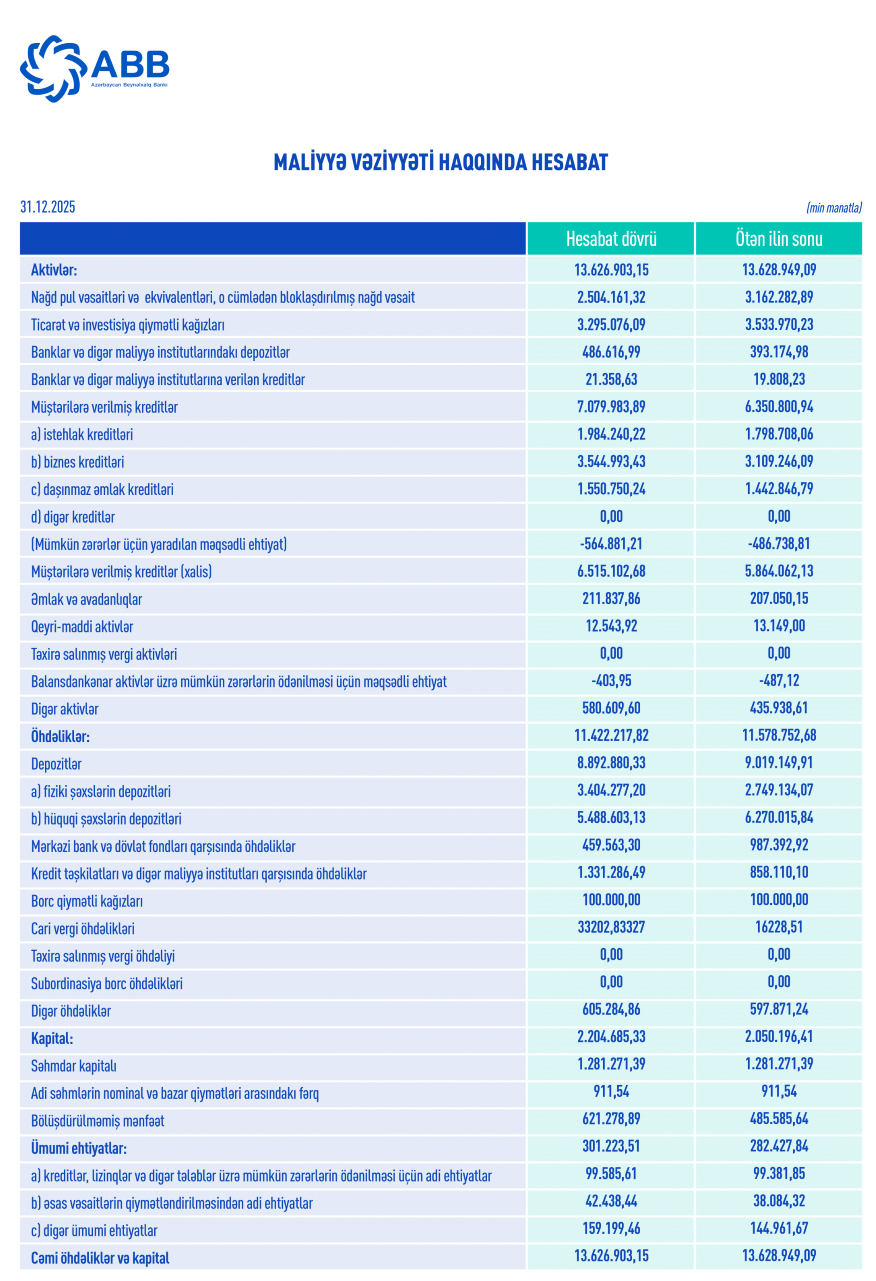 2025-ci ilin yekunlarına görə (31.12.2025 tarixinə), Azərbaycan Beynəlxalq Bankının (ABB) cəmi aktivləri 13 milyard 627 milyon manat təşkil edib.