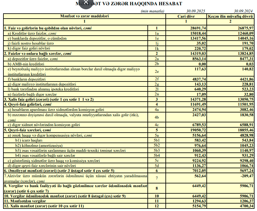 Hesabatın ən vacib dəyişikliyi isə kredit itkiləri üçün ehtiyat ayırmalarında baş verib. Bank bu məqsədlə 562,6 min manat vəsait ayırıb. Bu, ötən il 209,5 min manatlıq ehtiyat bərpasının tam əksidir və ümumilikdə 772,1 min manatlıq bir mənfi dəyişiklik deməkdir.