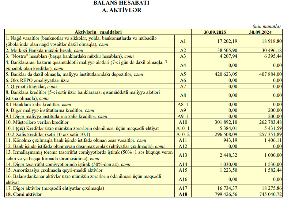 Bankın cəmi aktivləri 799,4 milyon manata çatıb. Bu, ötən ilin eyni dövrü ilə müqayisədə 54,4 milyon manat (7,3%) artımdır.