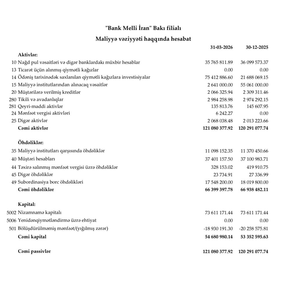 "Bank Melli İran"ın Bakı filialı 2026-ci ilin birinci rübü üzrə maliyyə göstəricilərini açıqlayıb.