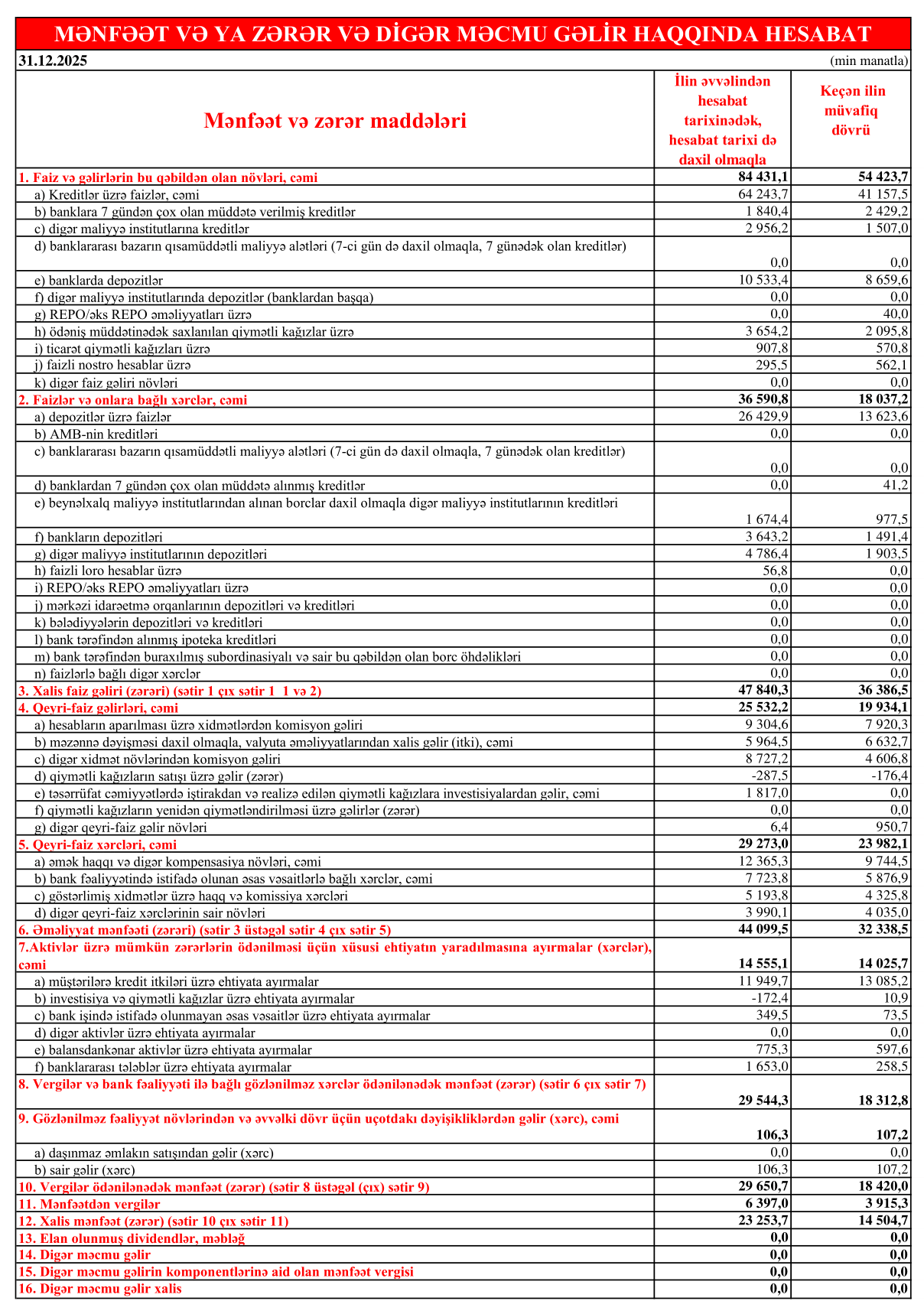 Bankın xarici valyuta əməliyyatlarından xalis gəliri, 6 milyon manata, digər qeyri-faiz gəlirləri isə 6,4 min manata bərabər olub.