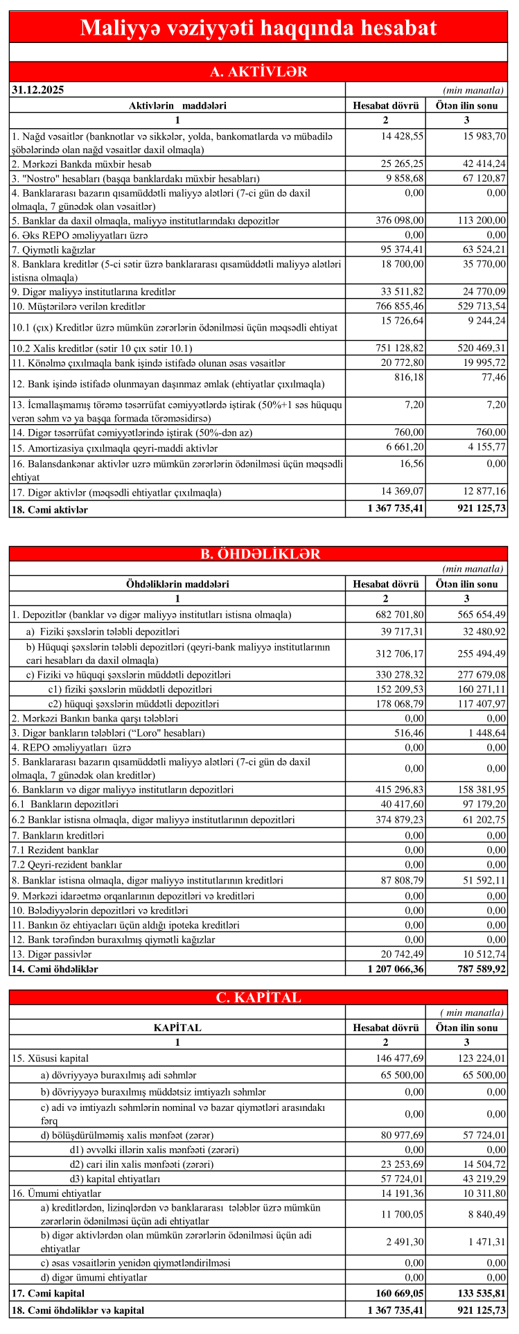 "Ziraat Bank Azərbaycan" ASC-nin 2025-ci il üzrə göstəriciləri məlum olub.