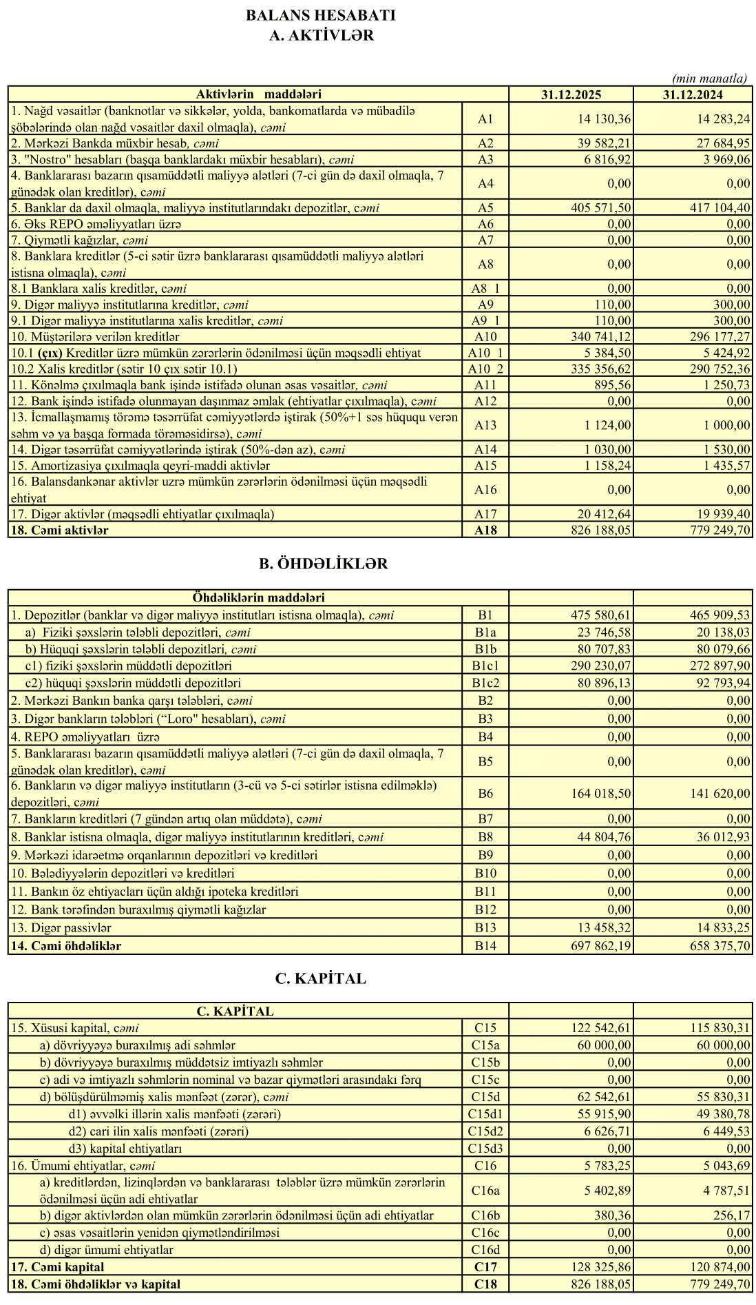 Xüsusi kapital isə ümumilikdə 122,5 milyon manat təşkil edib. Bu da 2024-cü ilin sonuna nəzərən 6,7 milyon manat (5,8%) artım deməkdir. Bankın səhmdar kapitalı isə dəyişməyərək 60 milyon manat səviyyəsində qalıb.