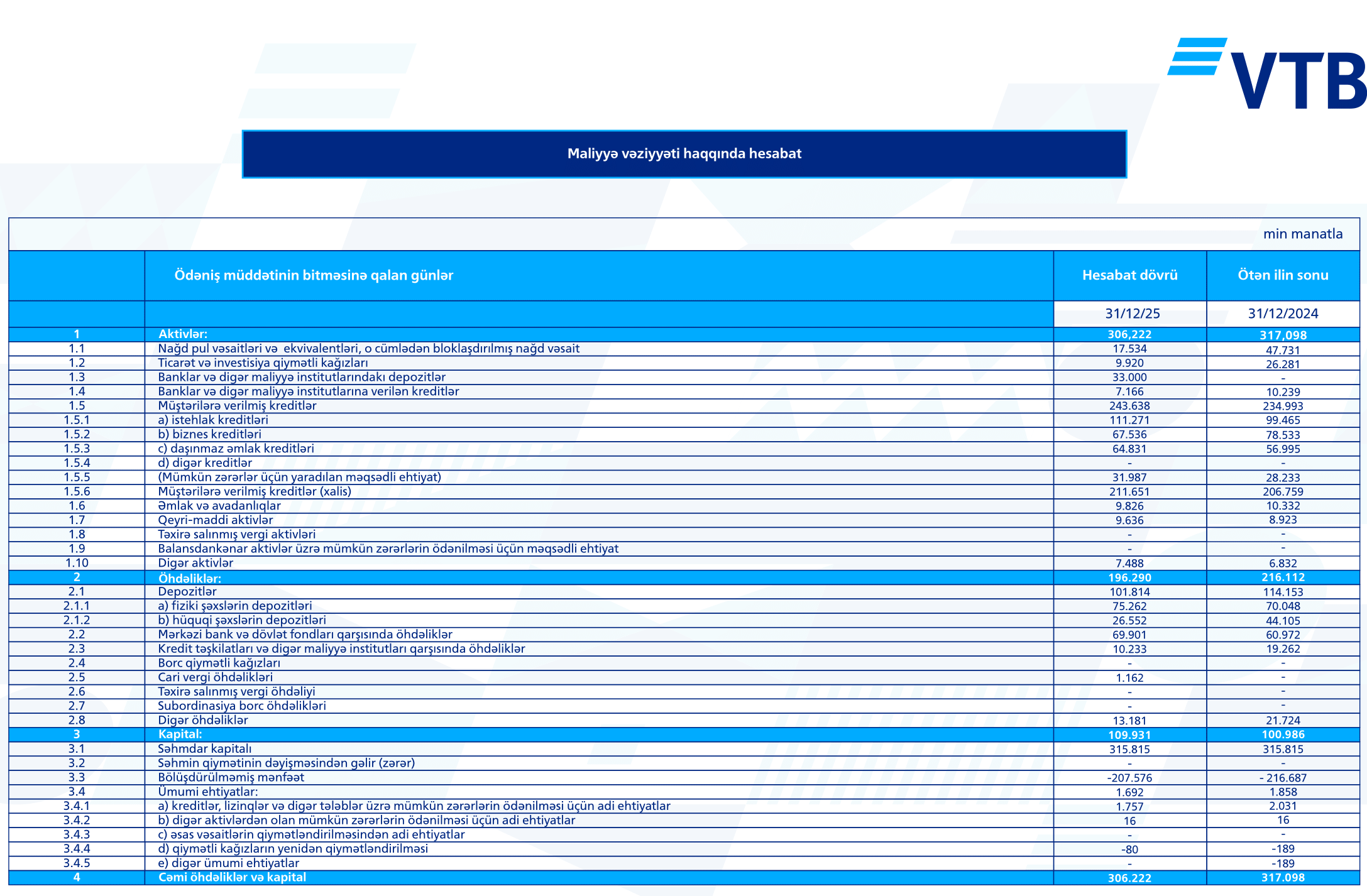 "Bank VTB (Azərbaycan)" ASC-nin cəmi aktivləri 2025-ci ilin sonunda 306,2 milyon manat təşkil edib. Bundan nağd pul vəsaitləri və ekvivalentləri bir ildə 17,5 milyon manata enib. ticarət və investisiya qiymətli kağızları portfeli isə 9,9 milyon manat olub.
