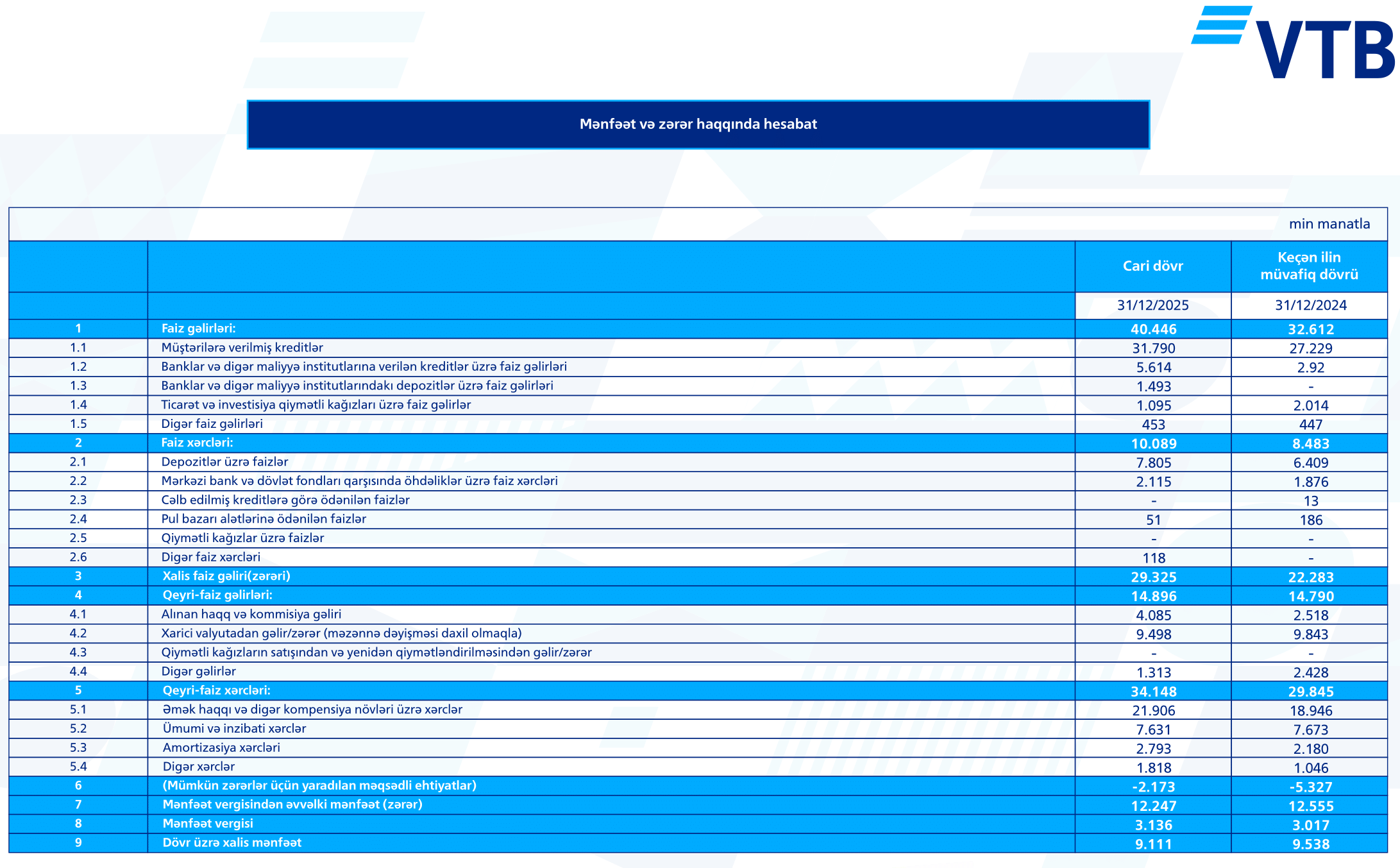 "Bank VTB (Azərbaycan)" 2025-ci ili ümumilikdə 9,1 milyon manat xalis mənfəətlə tamamlayıb.