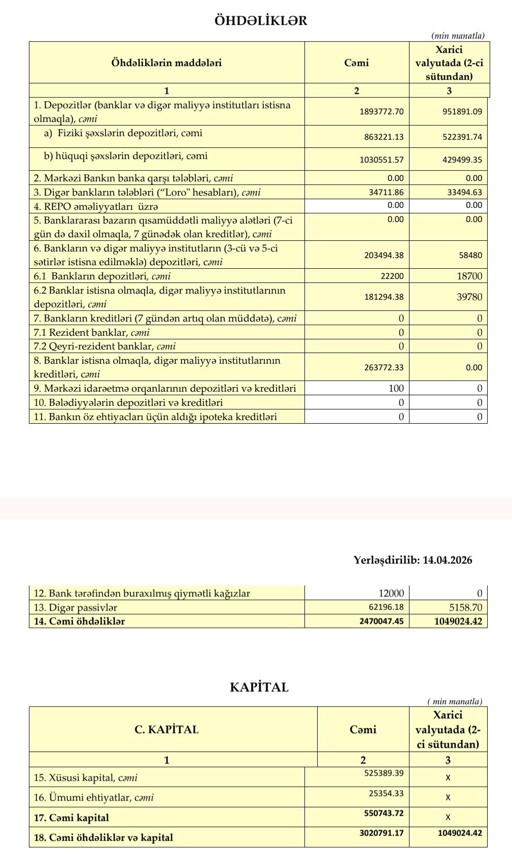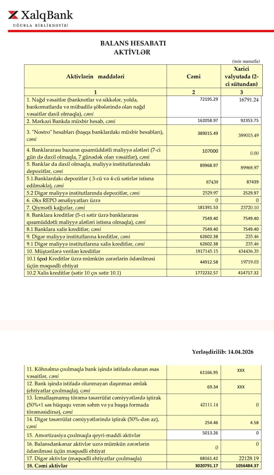2026-cı ilin birinci rübünün sonuna bankın aktivlərinin həcmi 3 milyard 21 milyon manat olub. Bu, 2025-ci ilin sonu ilə müqayisədə 163 milyon manat (5,1%) azdır.