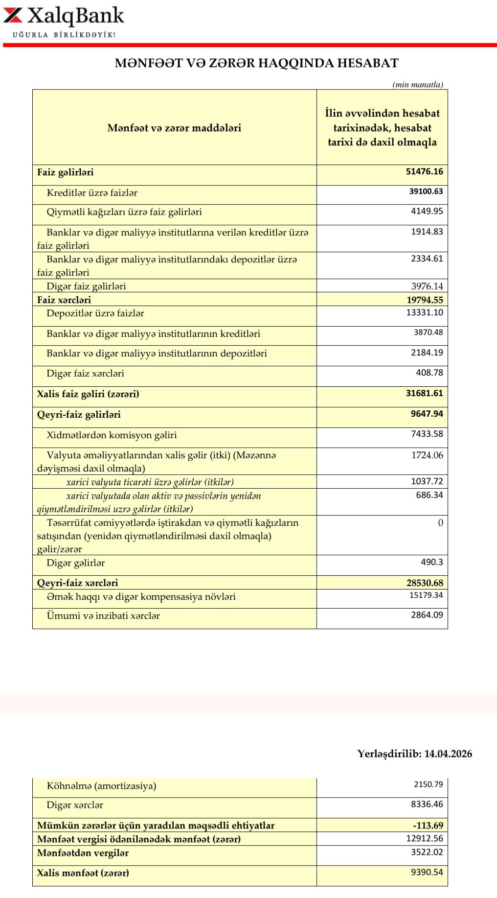 Mənfəət vergisi ödənilənədək mənfəət 12 milyon 912 min manat təşkil edib. Ödənilmiş mənfəət vergisinin həcmi 3 milyon 522 min manat təşkil edib. Nəticədə birinci rübdə bankın xalis mənfəəti 9 milyon 390 min manata yüksəlib. Bu, əvvəlki ilin birinci rübü ilə müqayisədə 2 milyon 467 min manat və ya 20,1% azdır.
