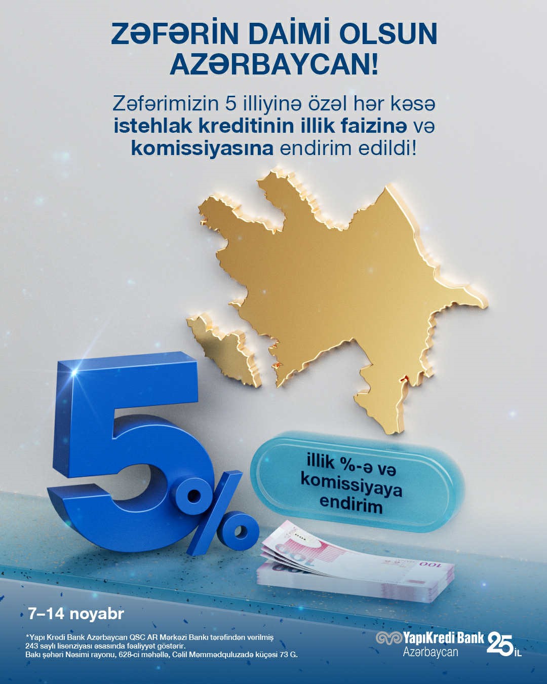Bu münasibətlə Yapı Kredi Bank Azərbaycan istehlak kreditlərinin rəsmiləşdirilməsi zamanı illik faiz və komissiya dərəcələrinə 5% endirim tətbiq edir.
