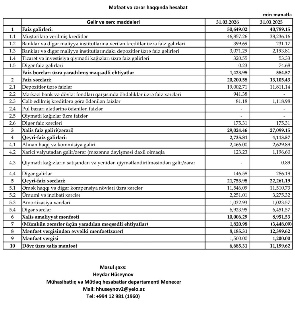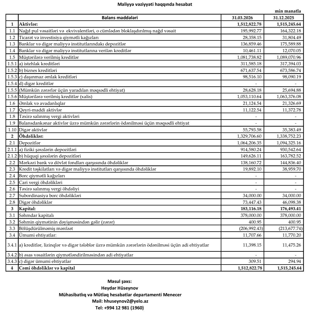 “Yelo Bank” ASC cari ilin birinci rübünün sonuna olan maliyyə nəticələrini açıqlayıb.