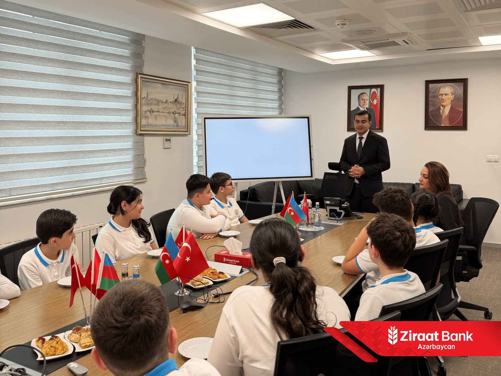 “Qlobal Pul Həftəsi 2026” çərçivəsində Ziraat Bank Azərbaycan tərəfindən təşkil olunan gənclərin maliyyə savadlılığının artırılmasına yönəlmiş maarifləndirici tədbir çərçivəsində Atatürk Liseyinin 7-ci sinif şagirdləri bankın ofisinə dəvət olunublar.