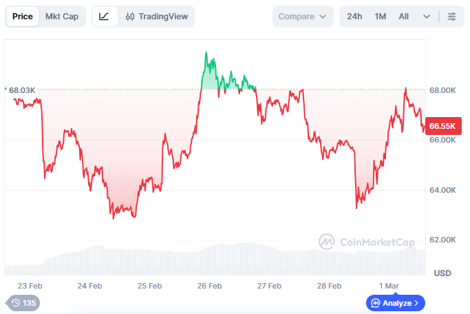 Hazırda (Bakı vaxtilə 14.30) bitkoinin qiyməti 66 570 dollar ətrafındadır.
