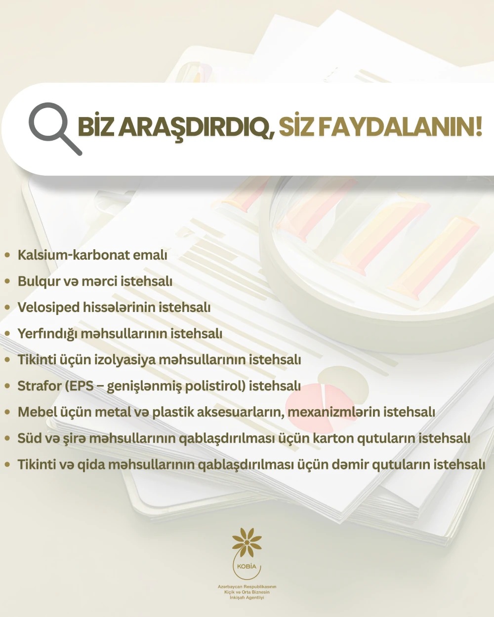 Bu sahələrdə məhsul və xidmətlər yaratmaq, eləcə də fəaliyyətini genişləndirmək istəyən sahibkarlar KOBİA-nın www.smb.gov.az internet saytına daxil olaraq müvafiq bazar araşdırmaları ilə tanış ola bilərlər.