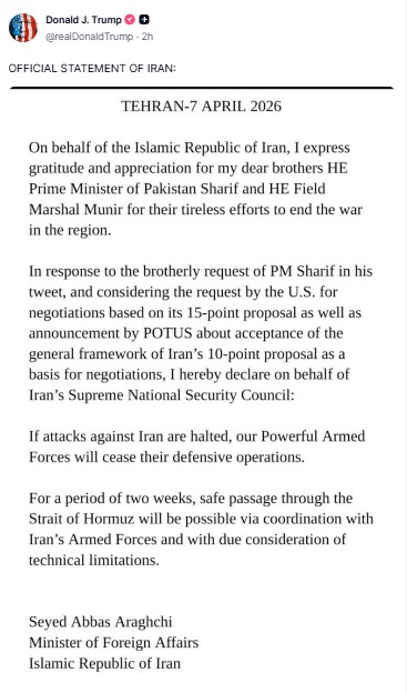 FED.az biznes və maliyyə xəbərləri portalı “Qafqazinfo”ya istinadən xəbər verir ki, ABŞ lideri “Truth” sosial şəbəkəsində İran xarici işlər naziri Abbas Əraqçinin ölkəsinin gərginliyin azaldılması şərtlərini əks etdirən postunu paylaşıb.