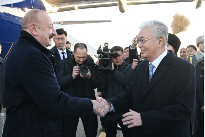 Dövlətimizin başçısını Qazaxıstan Prezidenti Kasım-Jomart Tokayev qarşıladı.