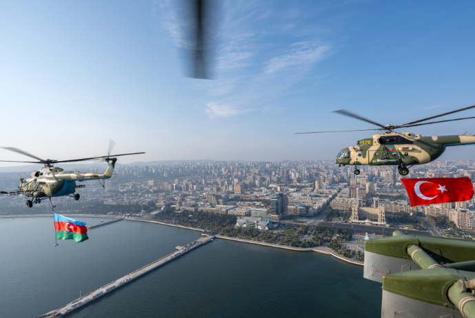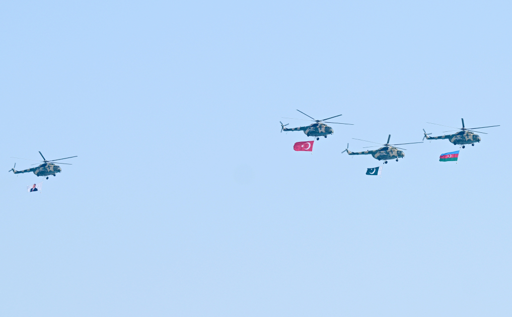 Azərbaycan və Türkiyə pilotlarının iştirakı ilə aviasiya nümayiş uçuşları isə izləyicilər üçün unudulmaz olub. Parad çərçivəsində uçan Mİ-17 döyüş-nəqliyyat helikopterləri Azərbaycan, Türkiyə və Pakistan respublikalarının Dövlət bayraqlarını daşıyıb, Mİ-17 helikopteri Ümummilli Lider Heydər Əliyevin portretini nümayiş etdirib. Həmçinin uzaqmənzilli hava-yer tipli raketlərlə təchiz olunmuş Mİ-17 döyüş-nəqliyyat helikopterləri, MFİ-17 təlim təyyarələri, L-39 təlim təyyarələri, İL-76 hərbi-nəqliyyat və silahlanmaya yeni qəbul edilmiş C-27J yük təyyarələri, silahlanmaya yeni qəbul edilmiş JF-17 (Cİ EF) çoxməqsədli qırıcı təyyarələr, Türkiyə Hərbi Hava Qüvvələrini təmsil edən F-16 çoxməqsədli qırıcı təyyarələr, modernizasiya olunmuş SU-25-Laçın hücum təyyarələri iftixar dolu hisslər yaşadıb. SU-25 hücum təyyarələri isə Azərbaycan Bayrağının rənglərini paytaxt səmasında canlandırıb.