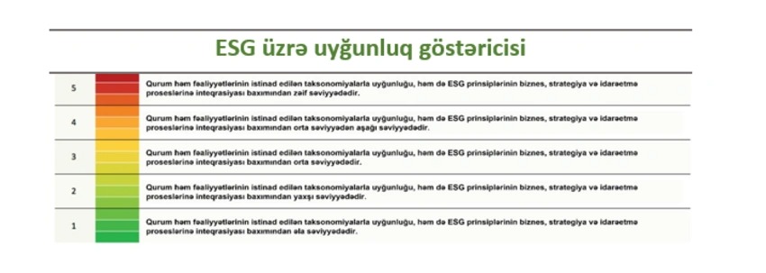 "Sustainable Fitch Ratings" təşkilatın ekoloji və sosial amilləri öz biznesinə, strategiyasına və idarəetməsinə inteqrasiya etmə səviyyəsini, eləcə də ümumi fəaliyyətini, öhdəliklərini və idarəetmə effektivliyini qiymətləndirir. Reytinqlər "1"-dən "5"-ə qədər şkala üzrə təqdim olunur (burada "1" ən yüksək, "5" isə ən aşağı göstəricidir).