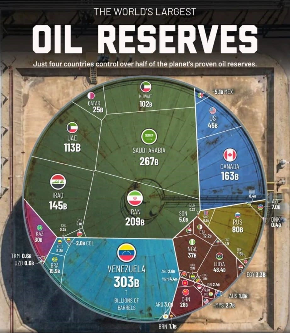 Bu vizuallaşdırma ölkələri 2025-ci ilin sonuna olan sübut olunmuş neft ehtiyatlarına görə sıralayır. Məlumatlar Neft İxrac Edən Ölkələr Təşkilatının (OPEC) 2025-ci il üçün İllik Statistik Bülleteninə əsaslanır. Rəqəmlər sübut olunmuş neft ehtiyatlarını əks etdirir və milyardlarla barellə təqdim olunur. Statistikaya həm ənənəvi xam neft yataqları, həm də tərkibində neft olan qumlar aiddir. Beləliklə,