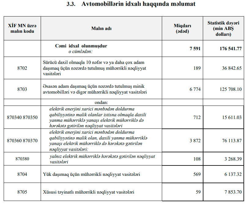 Fed.az biznes və maliyyə xəbərləri portalı Dövlət Gömük Komitəsinə istinadən xəbər verir ki, avtomobil idxalı ötən ilin eyni dövrü ilə müqayisədə dəyər ifadəsilə 37,5 milyon dollar və ya 27%, miqdar ifadəsilə isə 72 ədəd, başqa sözlə 0,9% azdır (miqdar azalması cüzidir, dəyər artımı isə yüksəkdir).