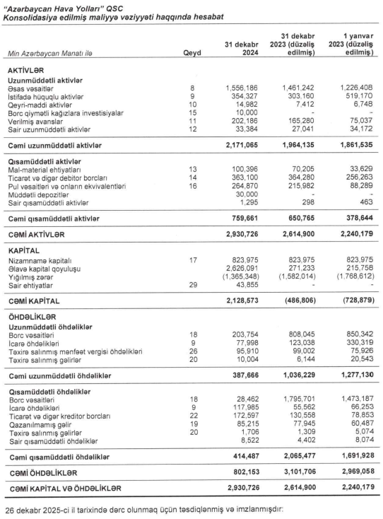 2024-cü ildə kapitalda baş verən dəyişikliklər özünü öhdəliklərdə də göstərib. AZAL-ın öhdəlikləri 2023-cü ilin sonundakı 3,1 milyart manatdan cəmi 802 milyon manata düşüb. Bununda təqribən yarısı – 387 milyon manatı, şirkətin maliyyə vəziyyətinə gərginlik yaratmayan uzunmüddətli öhdəliklərdir.