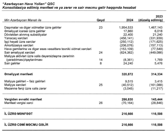 AZAL bu məbləğin 70 milyon manatını mənfəət vergisi kimi dövlət büdcəsinə ödəyəndən sonra 2024-cü ili 216 milyon manat xalis mənfəətlə tamamlayıb. Bu AZAL-ın 2023-cü ildəki göstəricisindən 100 milyon manat artaq olması ilə yanaşı, həm də indiyədək əldə etdiyi ən byöük mənfətdir.
