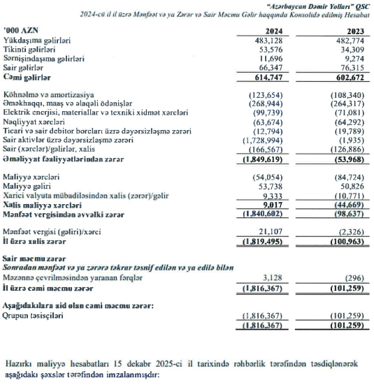 Yeri gəlmişkən, «Azərbaycan Dəmir Yolları»nın zərərlə işləməsi 2025-ci ildə də davam edir – 2025-ci ilin ilk 9 ayında şirkətin zərəri 60 milyon manata yaxınlaşıb. Gəlirləri isə 446 milyon manat olub kİ, bu da 2024-cü ilin analoji dövrü ilə müqayisədə cəmi 3 milyon manat artıqdır.