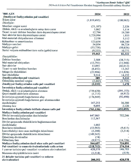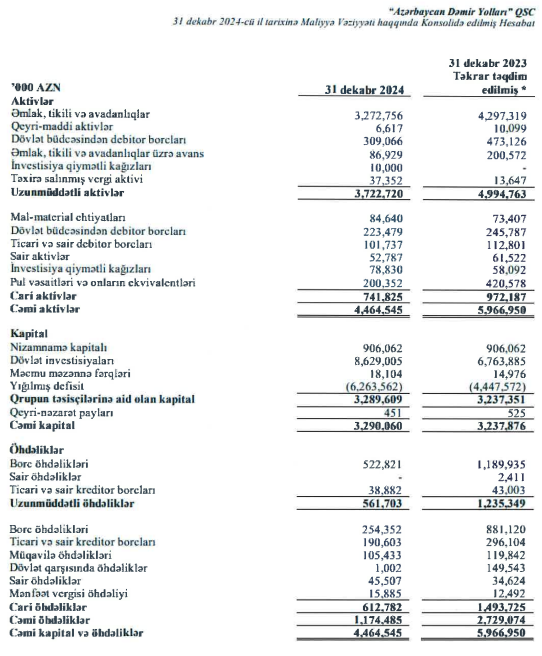 Son bir ildə Azərbaycan Dəmir Yollarının aktivləri 1,5 milyard manat və ya 25% azalaraq 2023-cü ilin sonundakı təqribən 6 milyard manatdan 2024-ün sonuna 4 milyard 464 milyon manata enib.