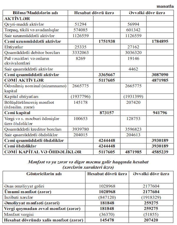 Nizamnamə kapitalı 2 milyon 665,8 min manat səviyyəsində qalıb. Kapitaldakı azalma əsasən mənfi kapital ehtiyatlarının 1 milyon 937,8 min manata çatması (zərərin böyüməsi) və bölüşdürülməmiş mənfəətin 145,2 min manata düşməsi (30% azalma) səbəbindən baş verib.