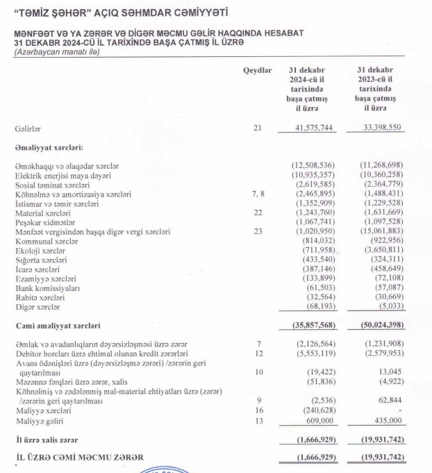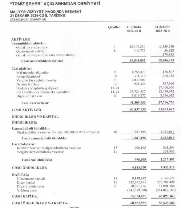 "Təmiz Şəhər" ASC 2024-cü ilin 31 dekabr tarixinə bitən il üzrə maliyyə hesabatını açıqlayıb.