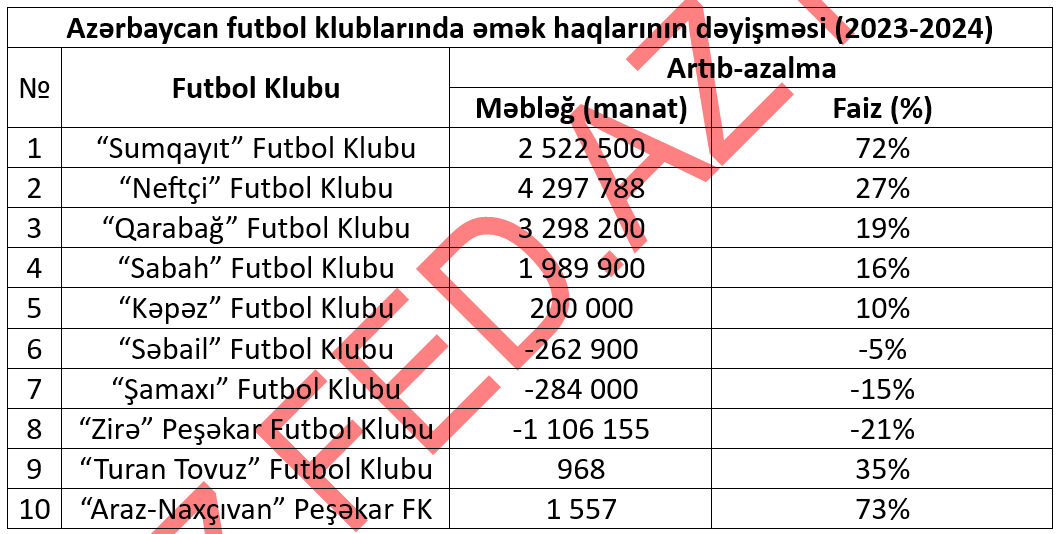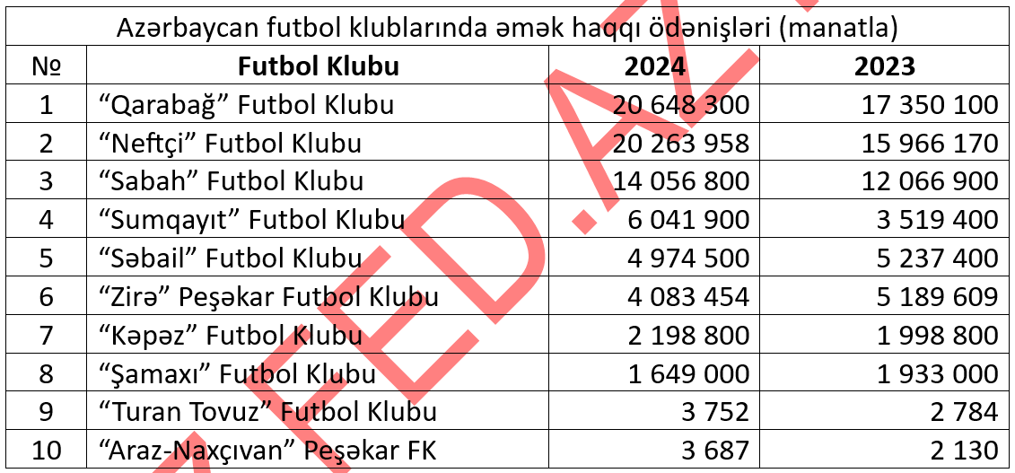 FED.az-ın hesablamaları göstərir ki, 2024-cü ildə əmək haqların an çox artıran klub «Sumqayıt» Futbol Klubu olub. Klubda 2023-cü ildə 3 milyon 519 min manat olan bu göstərici 2024-cü ildə 6 milyon 42 min manata yüksəlib. Artım 72 faiz təşkil edir ki, bu da kluba yeni transferlərin cəlb olunması və strukturun genişlənməsi ilə izah oluna bilər.