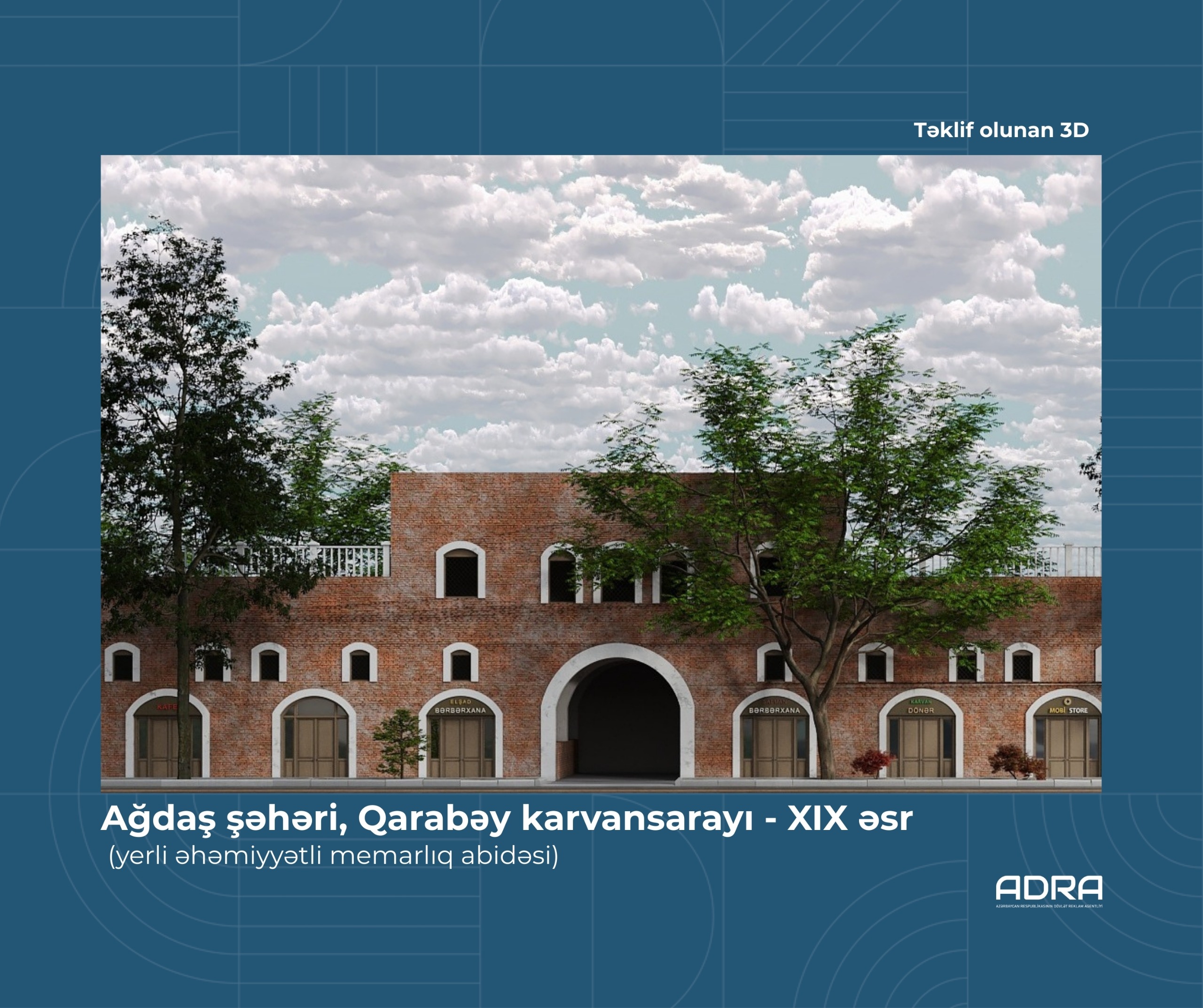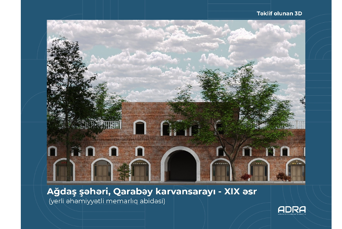 Tarixi binanın reklam mühitinin tənzimlənməsi məqsədilə ADRA tərəfindən karvansarayın 3D bərpa modeli və yeni reklam yerləşdirmə konsepsiyası hazırlanıb. Sahibkarlara reklam qurğularının tələblərə uyğun şəkildə yerləşdirilməsi üçün tövsiyələr verilib və yeni eskizlər təqdim edilib. Qeyd edək ki, Ağdaş şəhərində yerləşən tarixi karvansarayın fasadındakı reklam daşıyıcılarının vahid üsluba uyğunlaşdırılması ilə bağlı layihə ADRA tərəfindən digər aidiyyəti qurumlara da təqdim olunub.