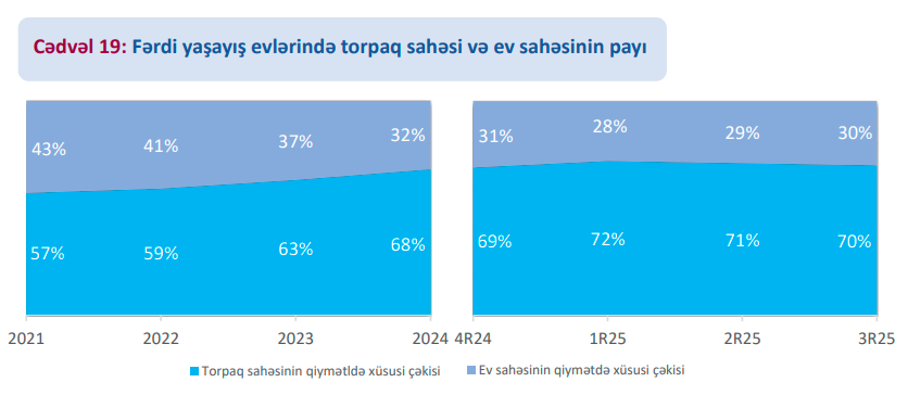 Qiymətin əsas hissəsini torpaq sahəsi formalaşdırır və bu pay 2025-ci ildə daha da artıb. Bu, tikinti xərclərinin artsa belə, bazarda qiyməti əsasən yerin yerləşməsi və torpaq təklifinin müəyyən etdiyini göstərir.