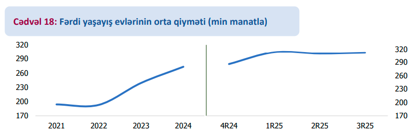 Ümumilikdə, 2024-cü il alıcı davranışının qeyri-sabit olduğu, lakin bazarın artım potensialını qoruduğu keçid dövrü kimi xarakterizə olunub. 2025-ci ildə qiymətlər daha yüksək səviyyədə stabilləşib. 2025-ci ilin I rübündə orta qiymət 313 min manat olub ki, bu da 2024-cü ilin IV rübü ilə müqayisədə +9,4% artım deməkdir.