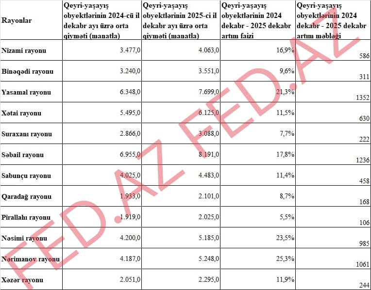 Nəsimi rayonunda isə 2024-cü ilin sonunda obyektlərin orta qiyməti 4200 manat olduğu halda, 2025-ci ildə bu rəqəm təqribən 1000 manat artaraq 5 185 manata yüksəlib.