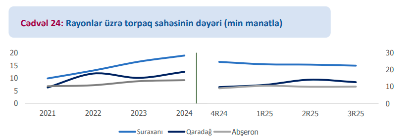 Qaradağ rayonunda 2025-ci ildə bazarda canlanma müşahidə edilib. 1R25 → 2R25 dövründə qiymətlər +28,2% yüksələrək 14,1 min manat olmuşdur. III rübdə isə 12,6 min manatsəviyyəsində stabilləşib. Abşeron rayonunda torpaq qiymətləri bütün dövr ərzində nisbətən sabit qalıb.